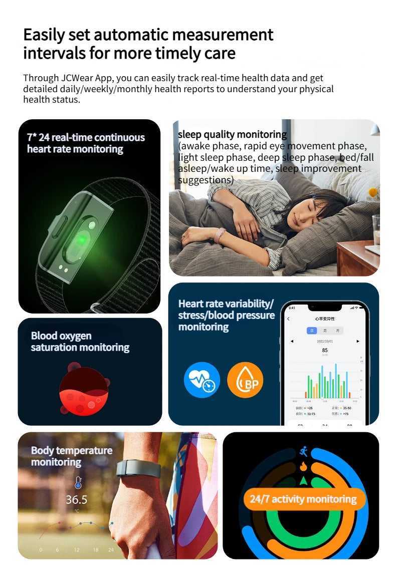 Metrics measured: Heart Rate Monitor,Blood Oxygen Monitor,Sleep Monitor,Blood Pressure Monitor,Body Temperature Monitor,Stress Monitor